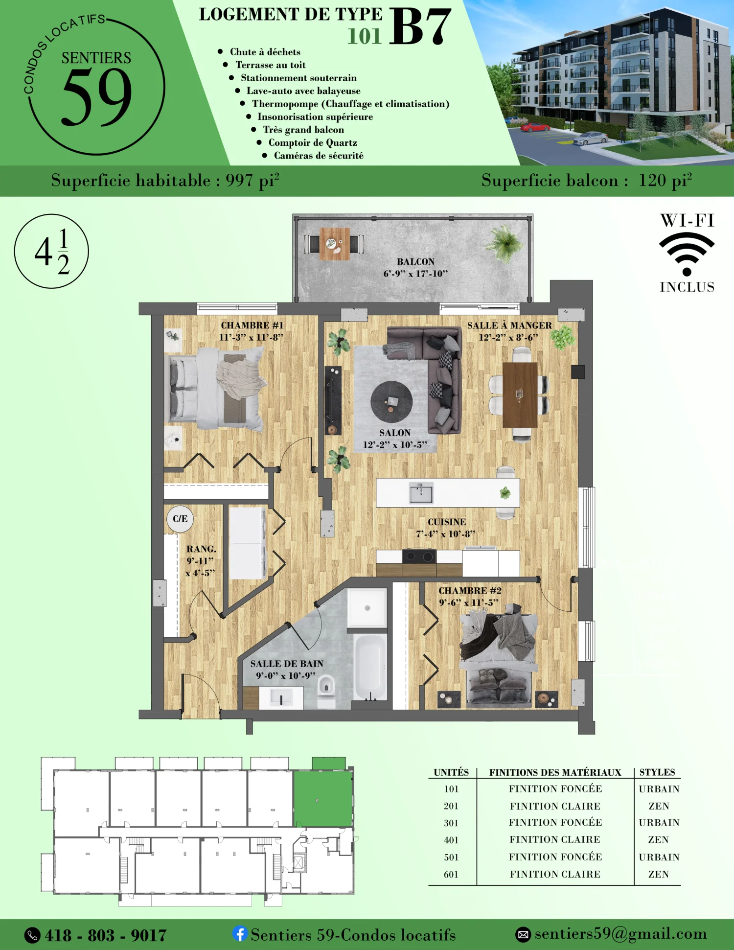 Utilisez le sélecteur d’étages pour naviguer à travers nos multiples appartements. Vous y verrez la description, les plans, les prix et la disponibilité de chaque appartement.