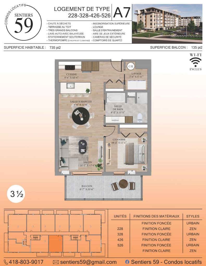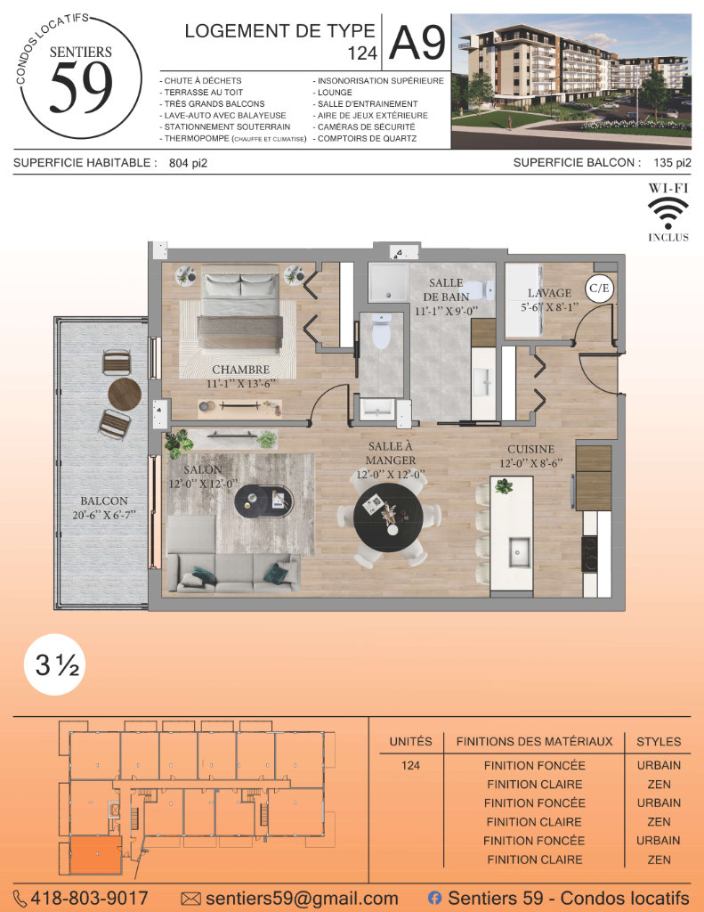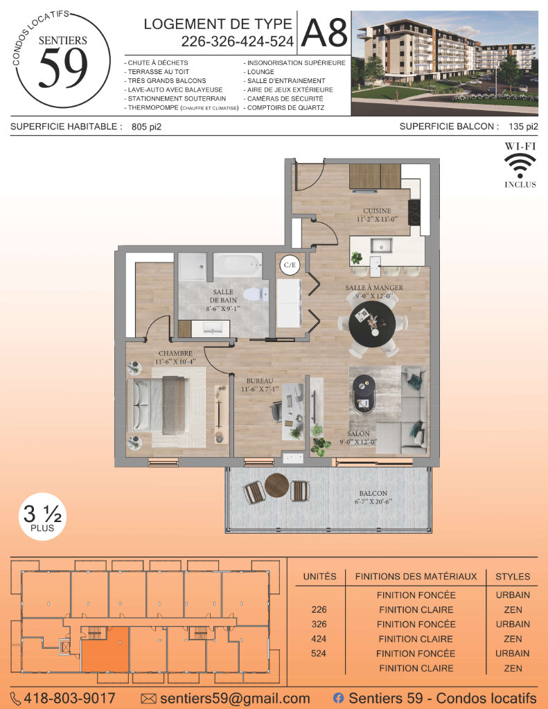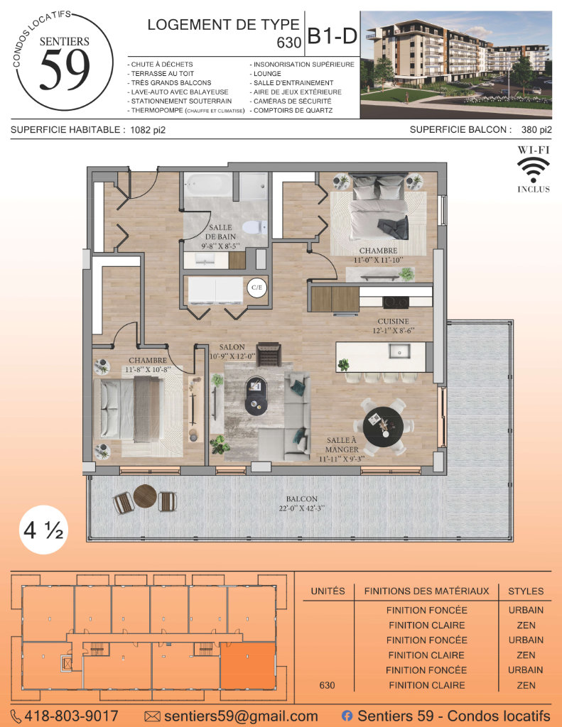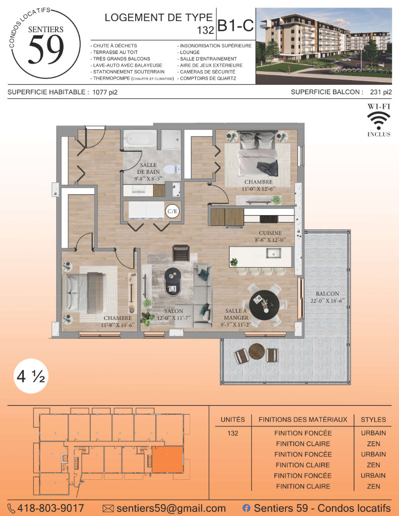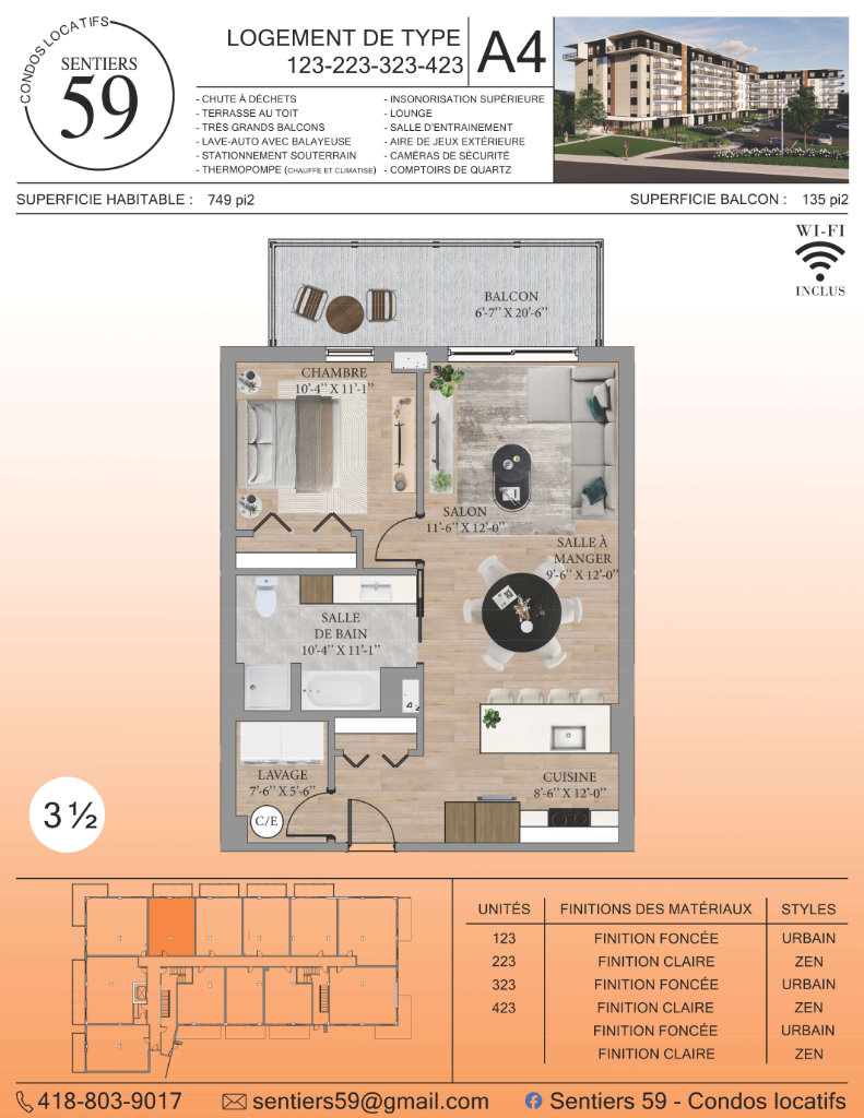 Utilisez le sélecteur d’étages pour naviguer à travers nos multiples appartements. Vous y verrez la description, les plans, les prix et la disponibilité de chaque appartement.