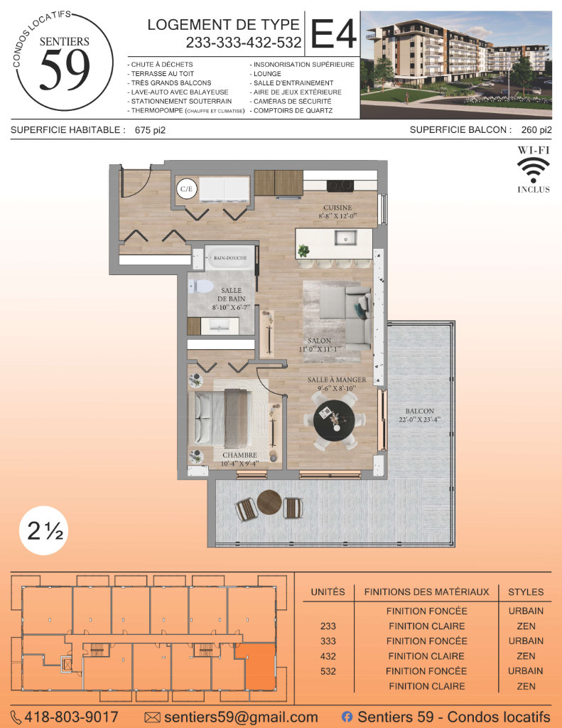 Utilisez le sélecteur d’étages pour naviguer à travers nos multiples appartements. Vous y verrez la description, les plans, les prix et la disponibilité de chaque appartement.